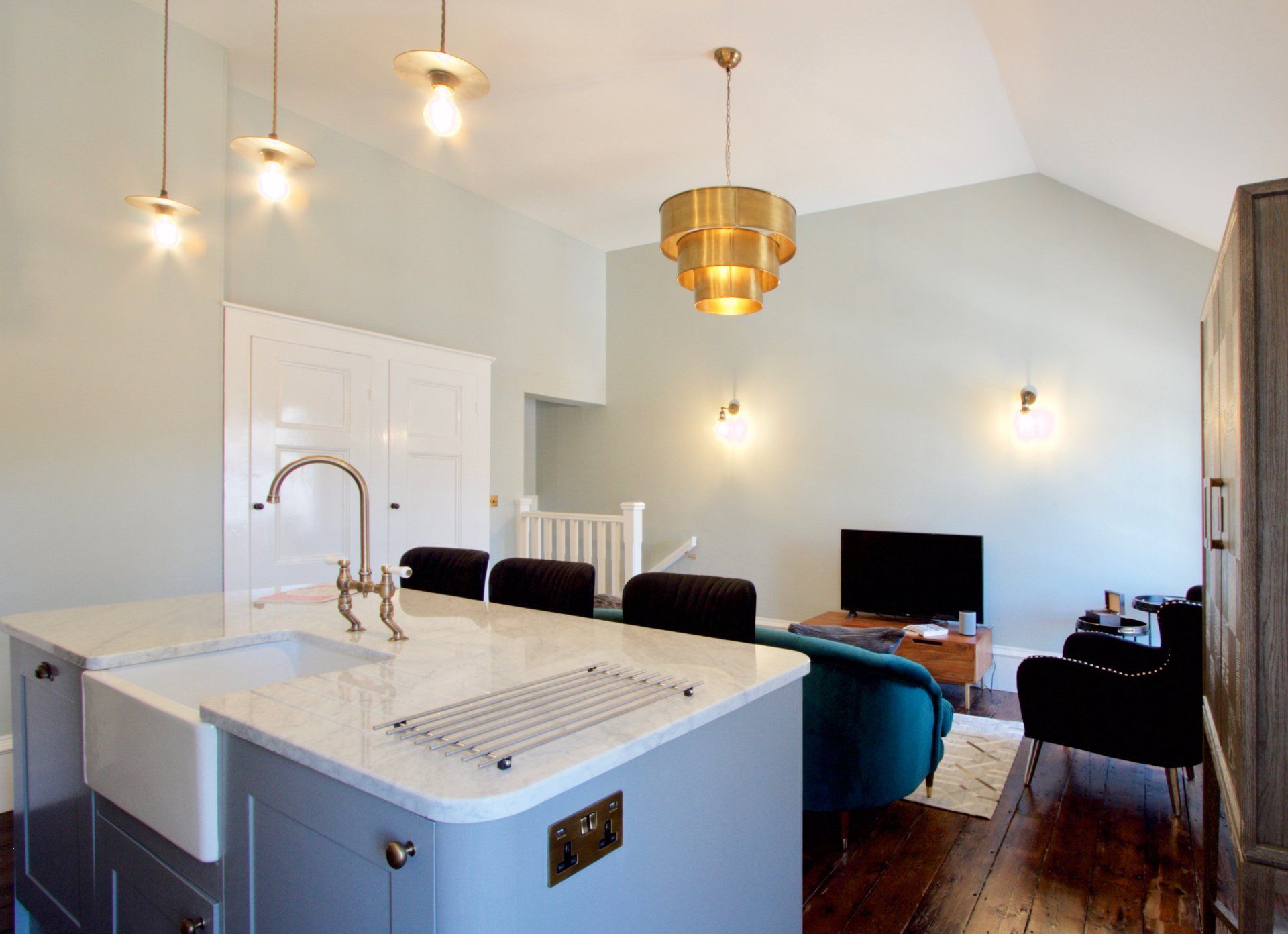 Our second floor one-bedroom apartment is styled in teal and black to give a sophisticated feel. It mimics Brinks in size as it sits above it, providing similar views but from a loftier height. A 42-inch smart TV with complimentary Netflix, DVD player and an Amazon Alexa provide everything you need for entertainment. The double bedroom has a beautiful original fireplace, a chest of drawers and hanging space neatly tucked away behind the door.